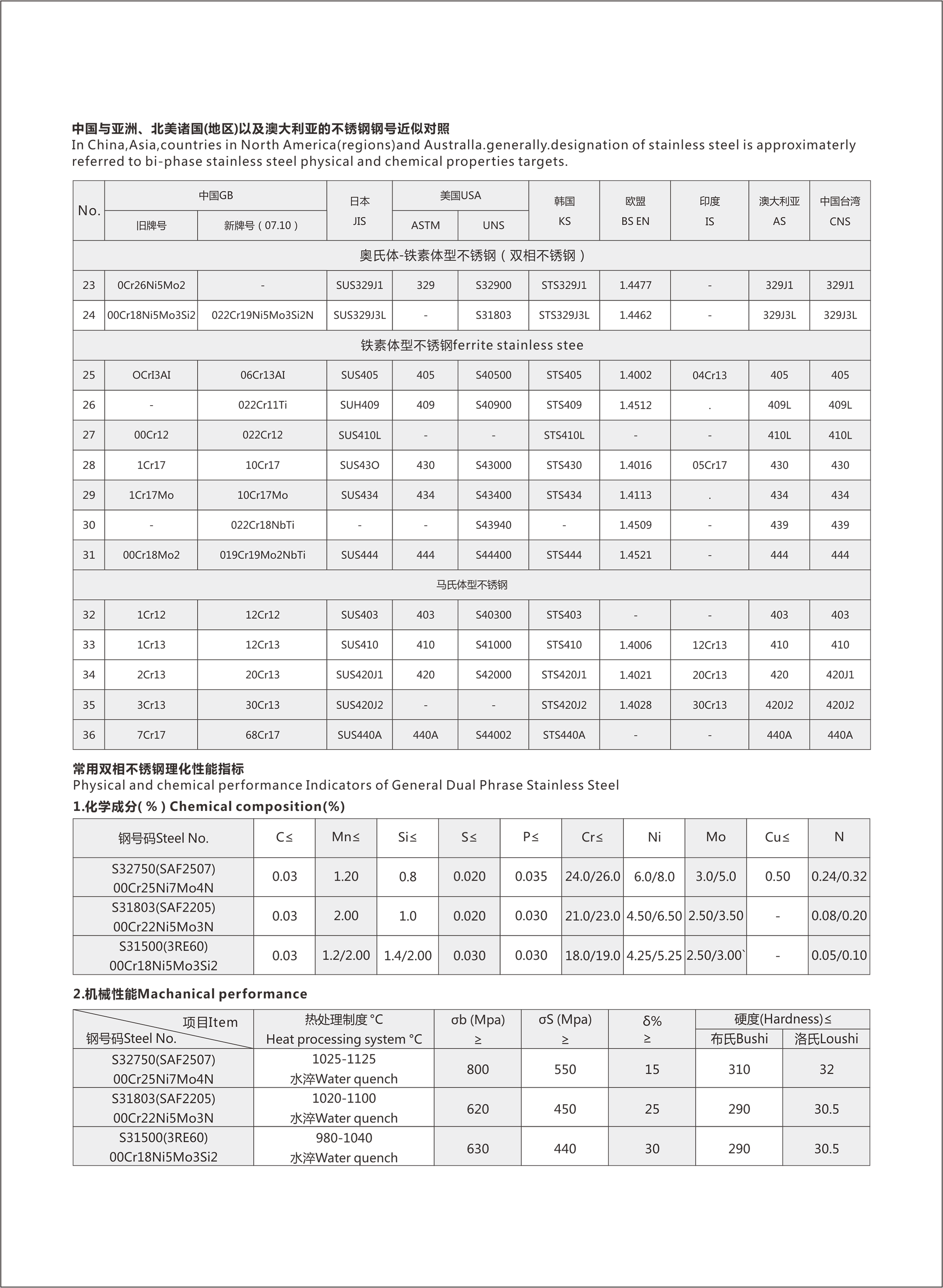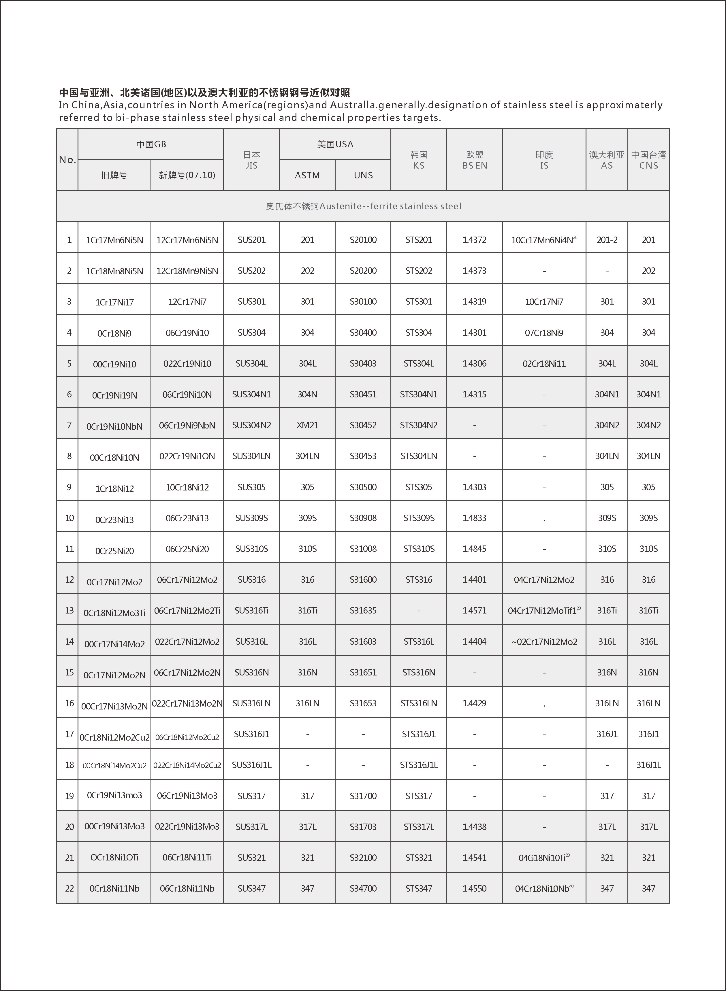 中國與亞洲、北美諸國以及澳大利亞的不銹鋼號近似對照